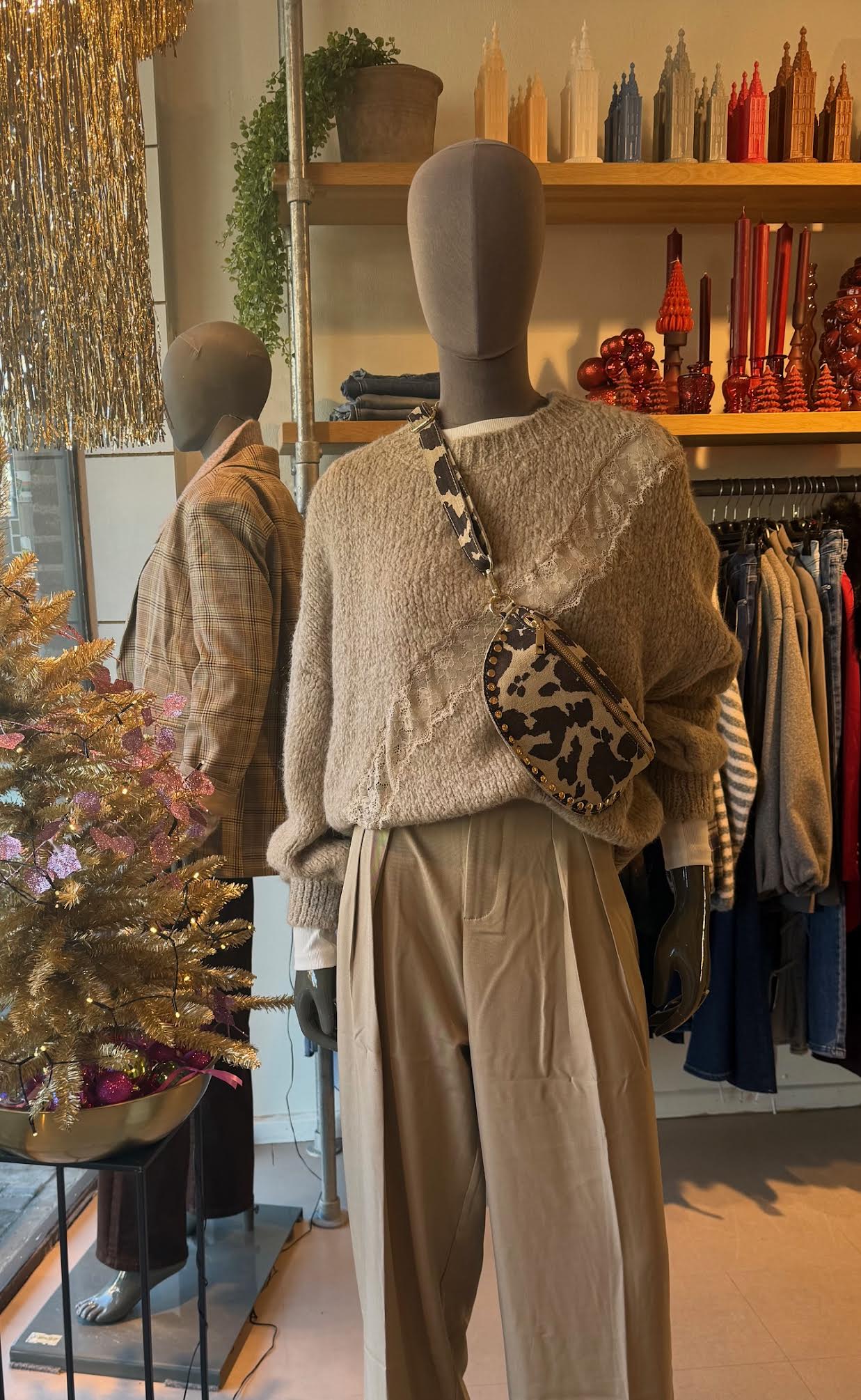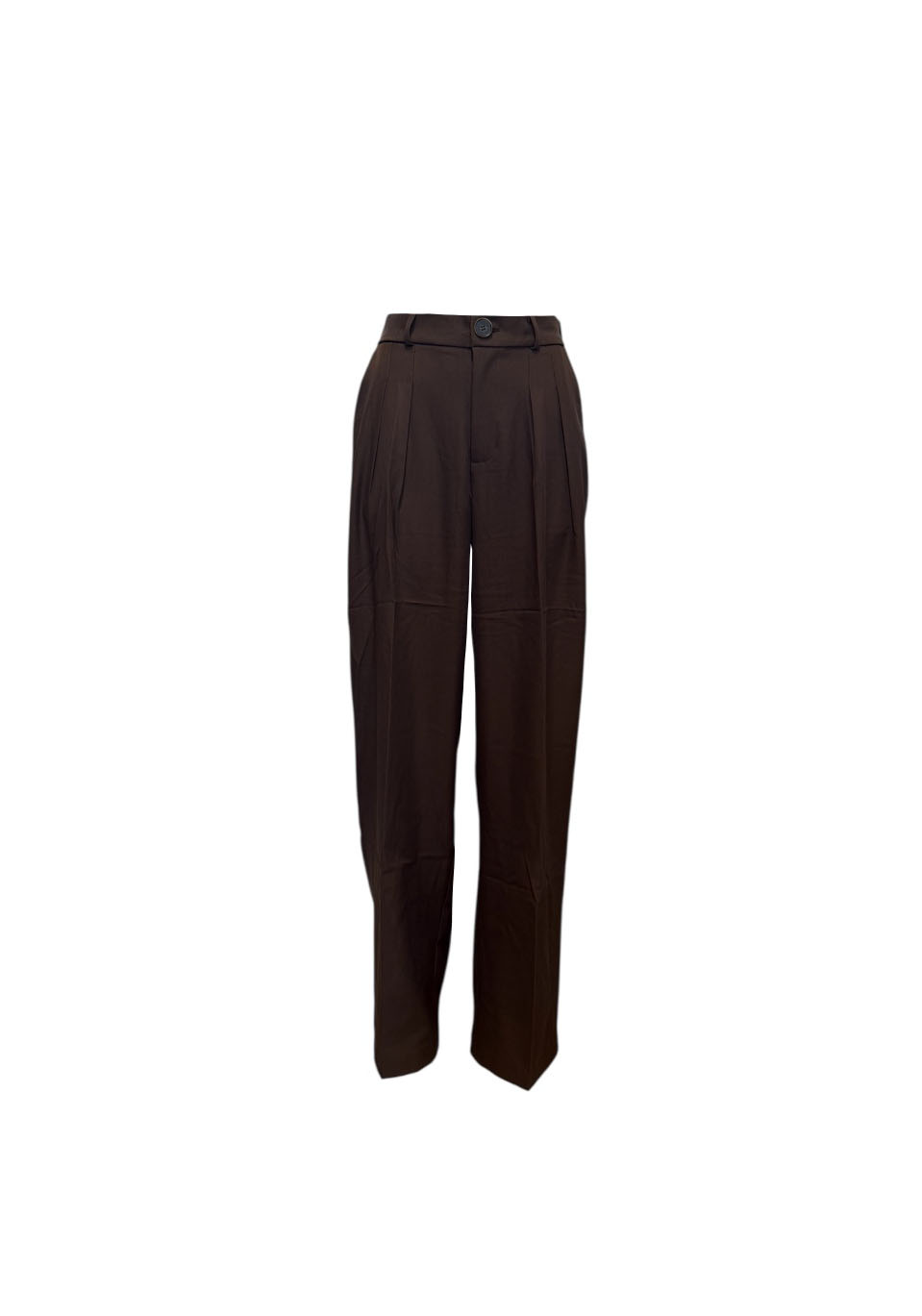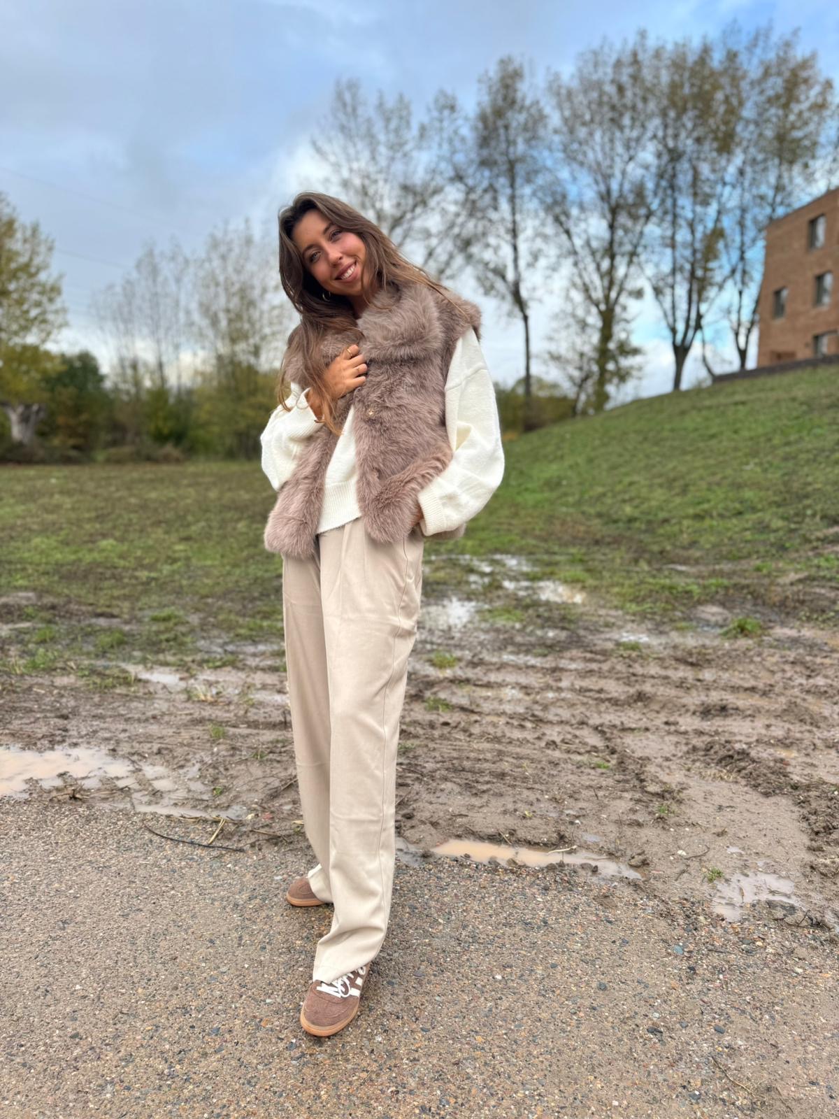Beige pantalon rechte pijp plooien, elastische tailleband achter en steekzakken (ons model heeft maat 36 en draagt hier een S)