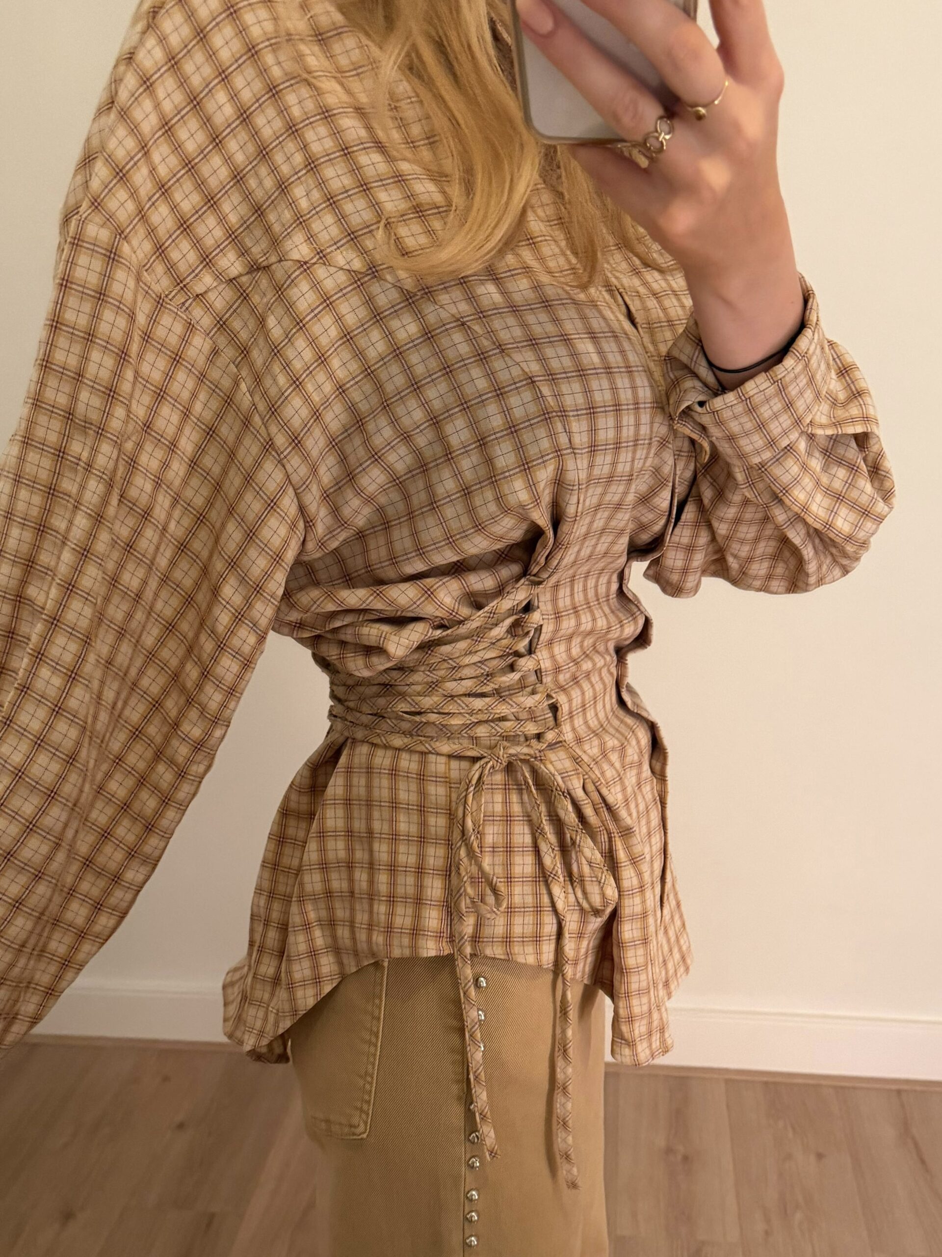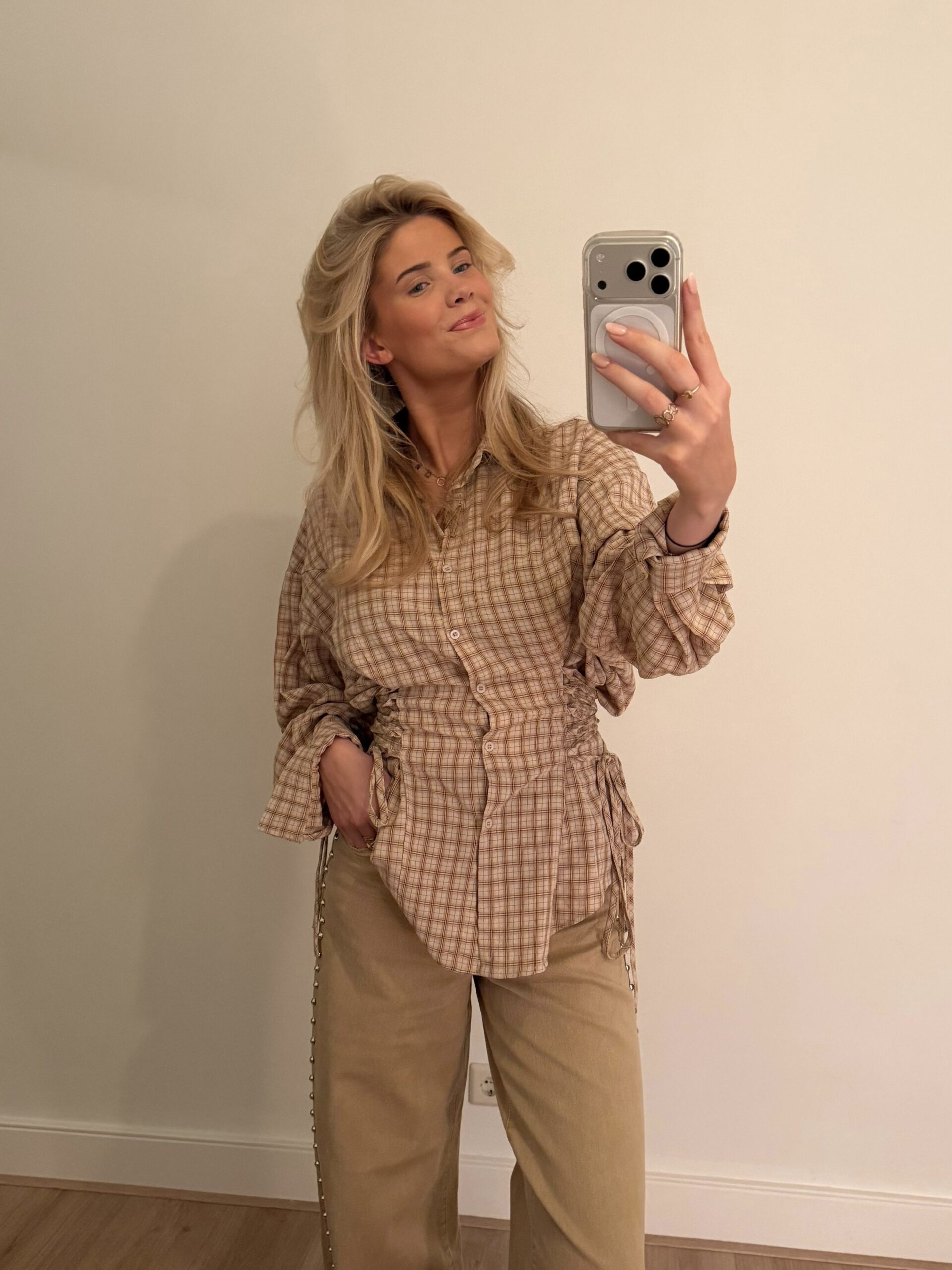 Camel ruiten blouse taps toelopend en met verstelbare koordjes aan de zijkant