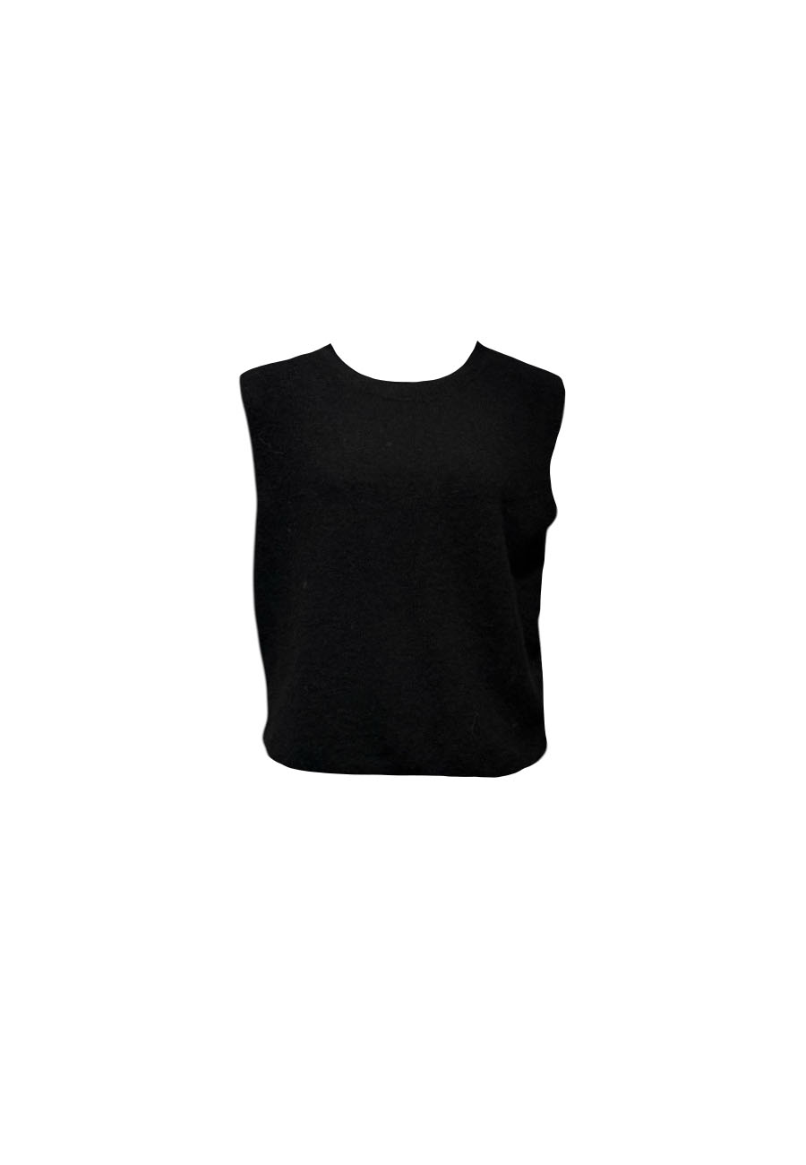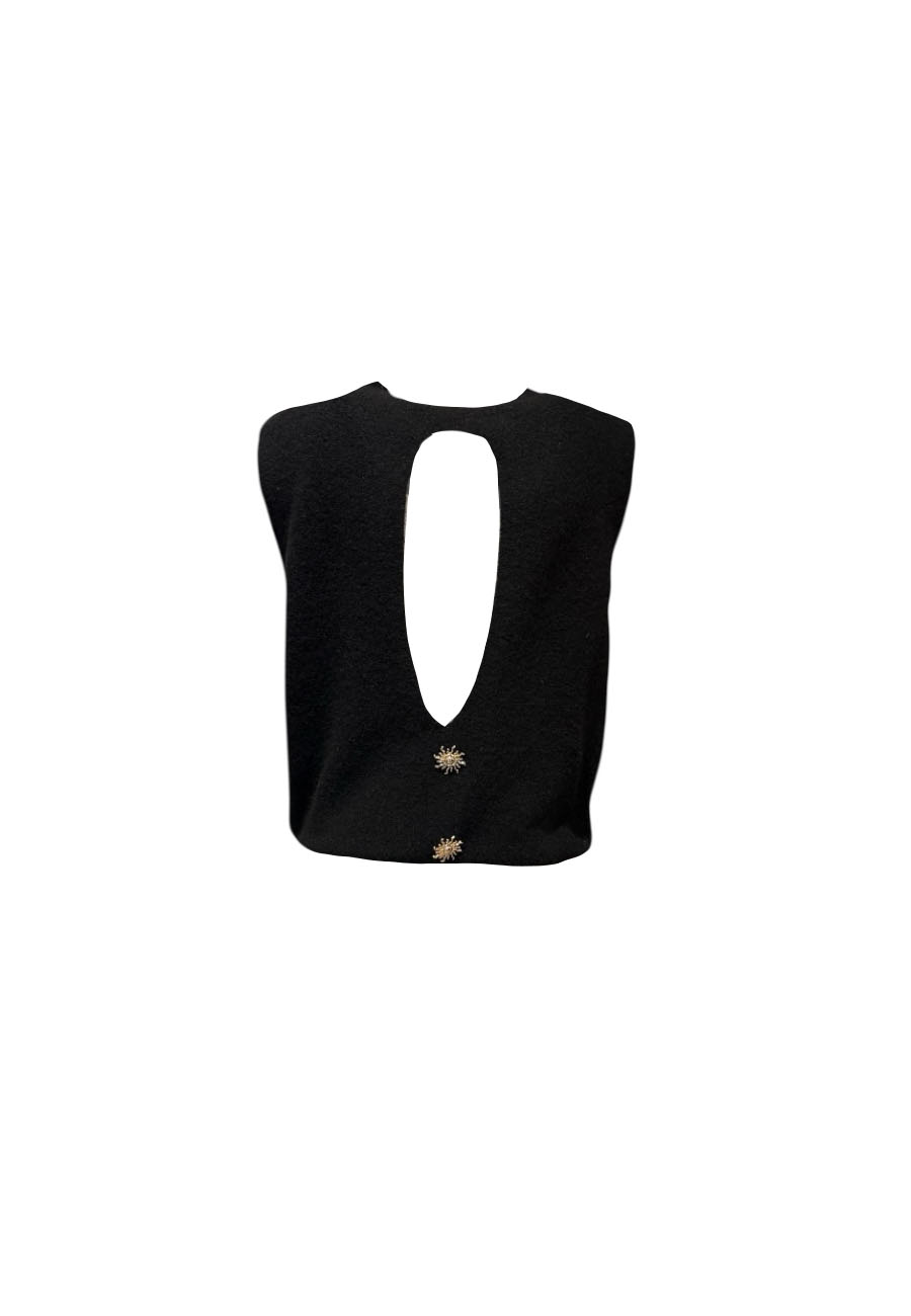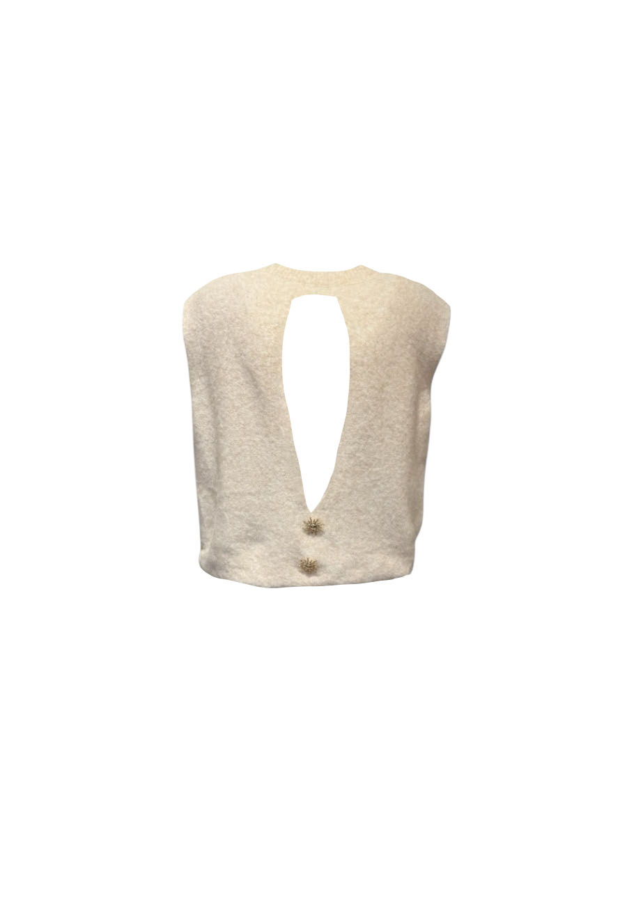 Ecru mouwloos gebreid truitje met open achterkant
