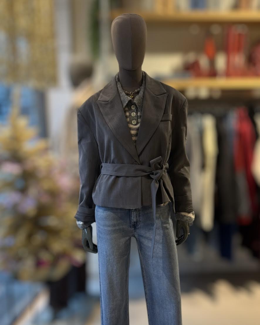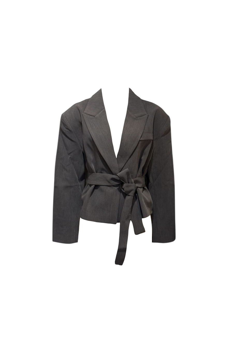Grijze korte blazer met strik ceintuur