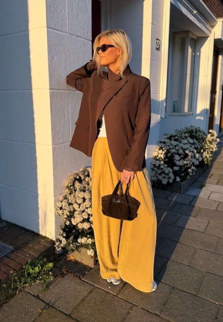 Okergele tencel broek met elastische tailleband en koord, plooien en steekzakken (ons model heeft maat 36 en draagt hier een s/m)