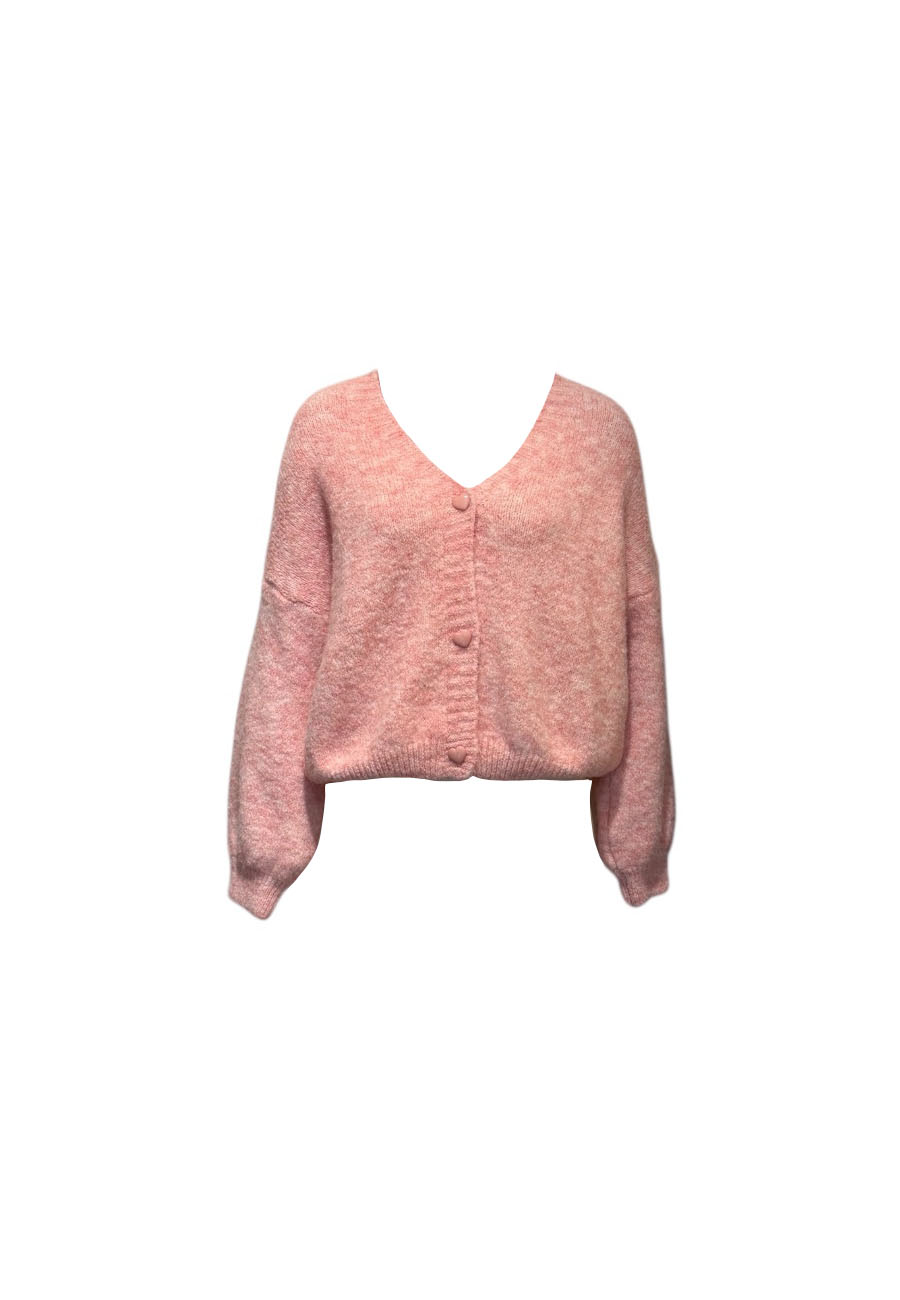 Roze mêlee vestje (wol/acryl/polyamide/spandex) met hartjes knopen, 1 maat valt als xs t/m l